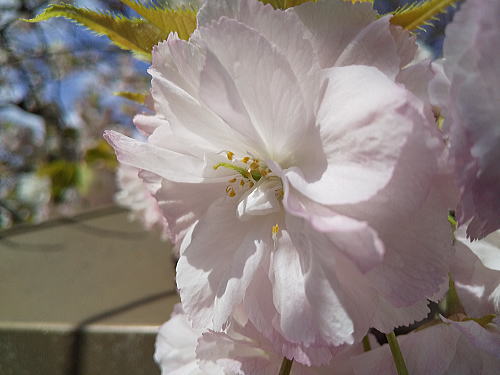 普賢象桜は八重咲きのサトザクラの一品種で、中央にある2本の雌しべが緑色をした小さな葉になっているのが特徴。