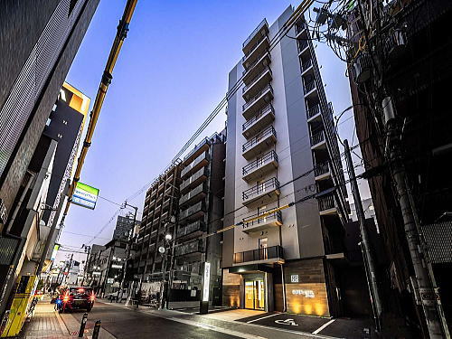 大阪メトロ四ツ橋線「肥後橋」7番出入口から徒歩約2分にあるのが「スーパーホテル梅田・肥後橋」。